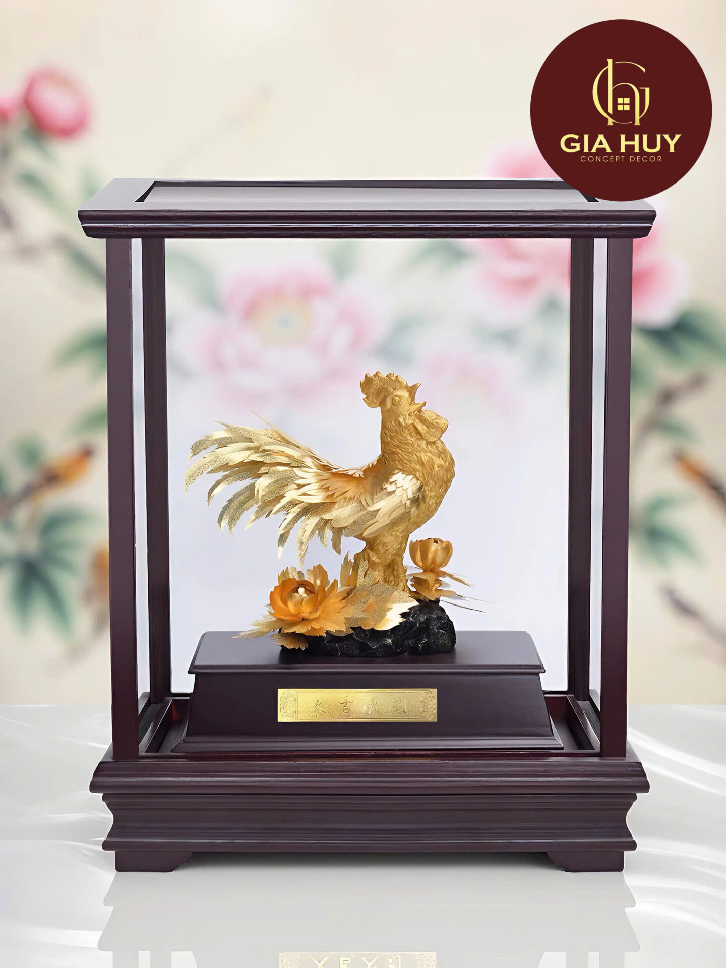 Chất liệu: Hợp kim cao cấp dát vàng 24K, khung gỗ kính